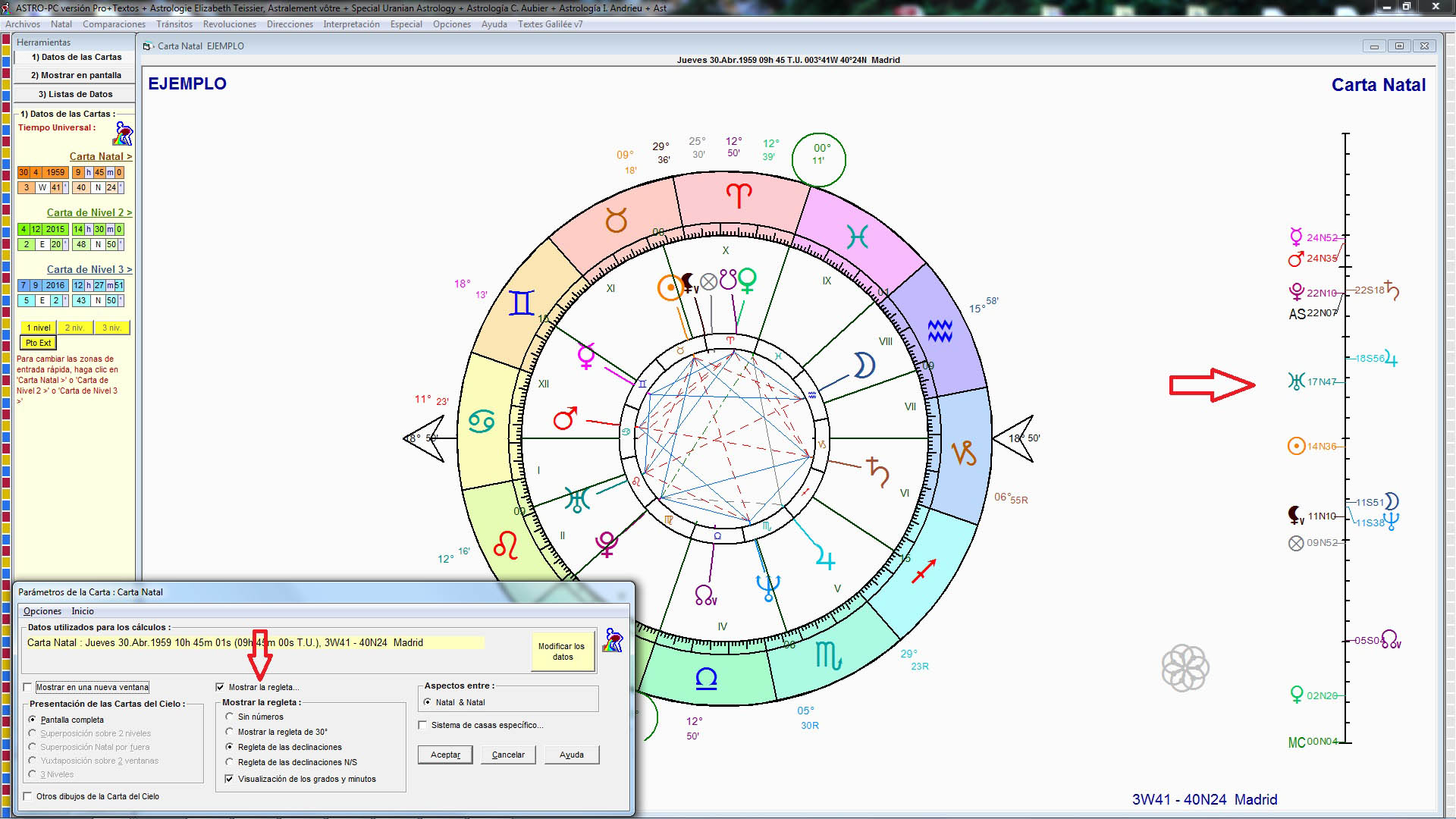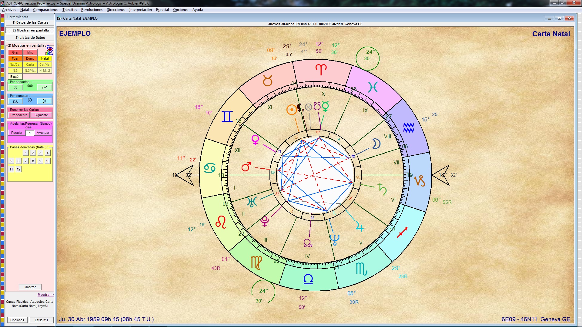 Aspectos programables: El número de aspectos menores programables ha pasado de 6 a 13. Así que ahora tiene un total de 34 aspectos posibles (mayores + menores + paralelos) en Astro-PC. — PRO, BAS, DAT