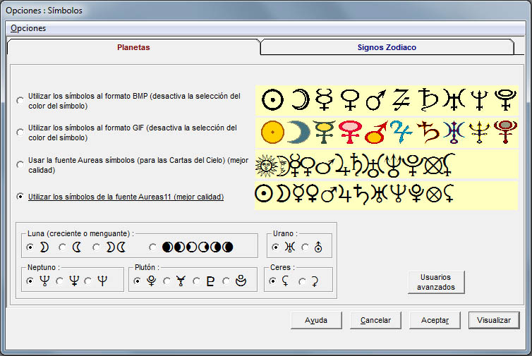 Vista previa de sus cambios: Cuando se hacen modificaciones en las opciones del programa, un nuevo botón “Visualizar” permite ver en pantalla una Carta natal con los cambios que ha hecho. Esto le dará una idea de la nueva configuración antes de validarla. — PRO, BAS